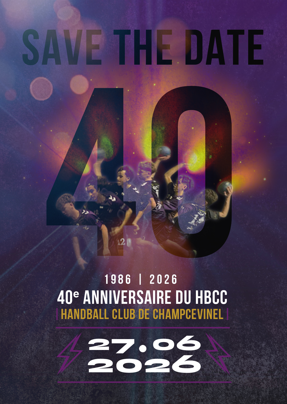Détails : réalisation d’une affiche type « save the date » pour les 40 ans du HBCC, le club de handball de Champcevinel, à côté de Périgueux en Dordogne.